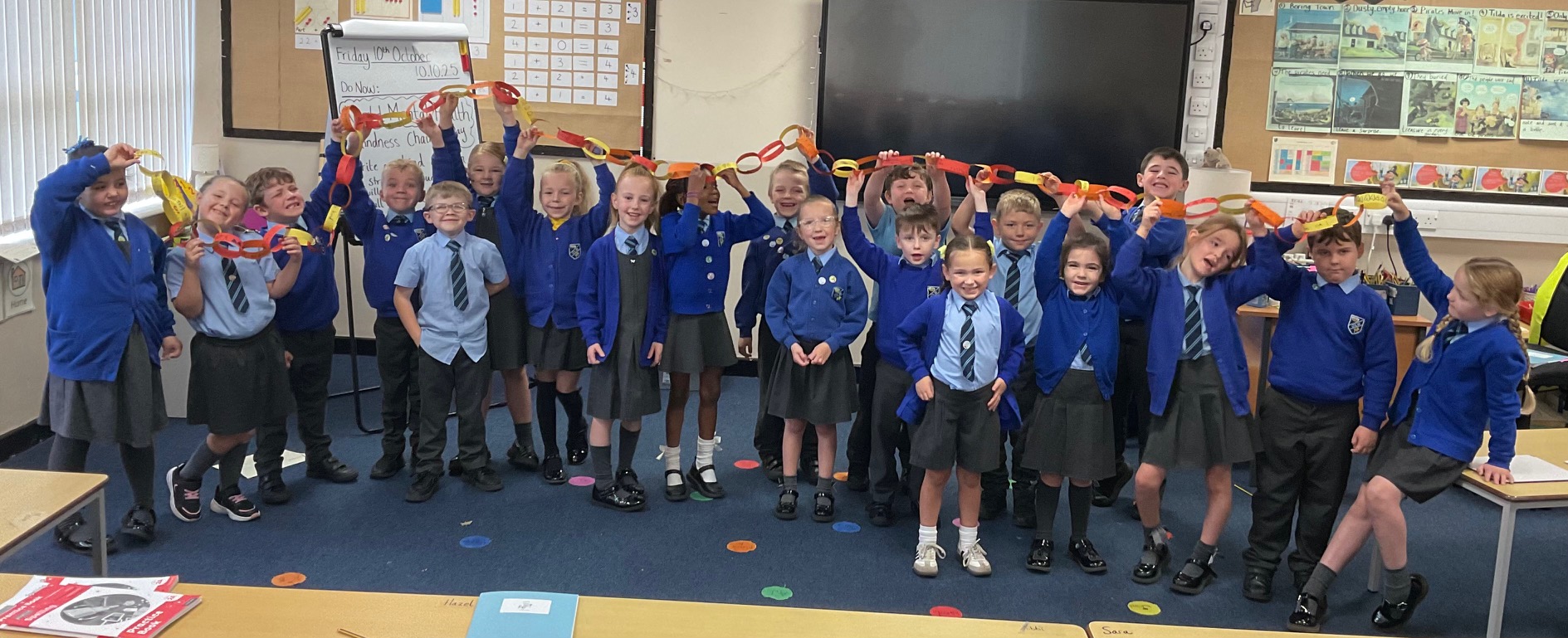 Week 6: Mental Health Awareness Day saw us adding a touch of yellow to our classroom with our bright and sunny Kindness Chain. We each wrote on chains how we had helped people feel happy. It made us feel really cheerful doing it. It was a great start to our Friday. Look at how happy we are!